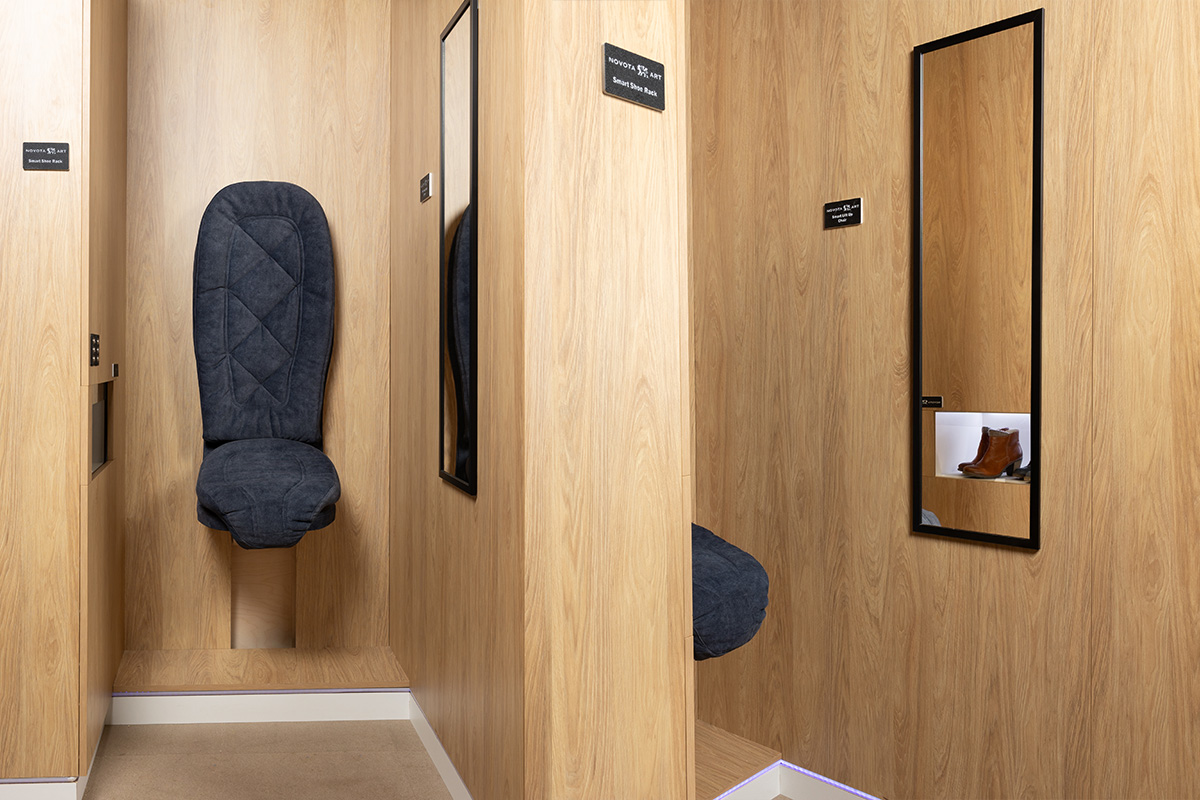 Asistívna šatníková zostava pre komfortné obúvanie spája inteligentnú skrinku na topánky so sterilizáciou a čistením a vysúvacie ergonomické kreslo. Zostava prináša moderný a hygienický spôsob uskladnenia obuvi s automatizovanou asistenciou pri obúvaní.