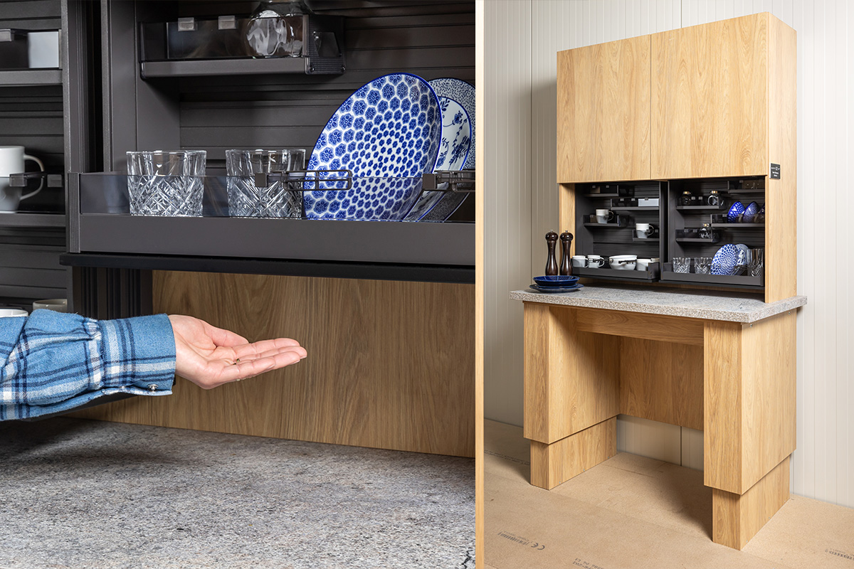 Pokročilý mechatronický mechanizmus využívajúci elektronicky riadené aktuátory na tiché a plynulé otváranie a zatváranie skriňových dvierok. Podporuje hlasové ovládanie, dotykové senzory a integráciu do aplikácie s prístupom pre mobilného robotického asistenta, čo umožňuje plnú automatizáciu a prepojenie v rámci inteligentnej domácnosti.