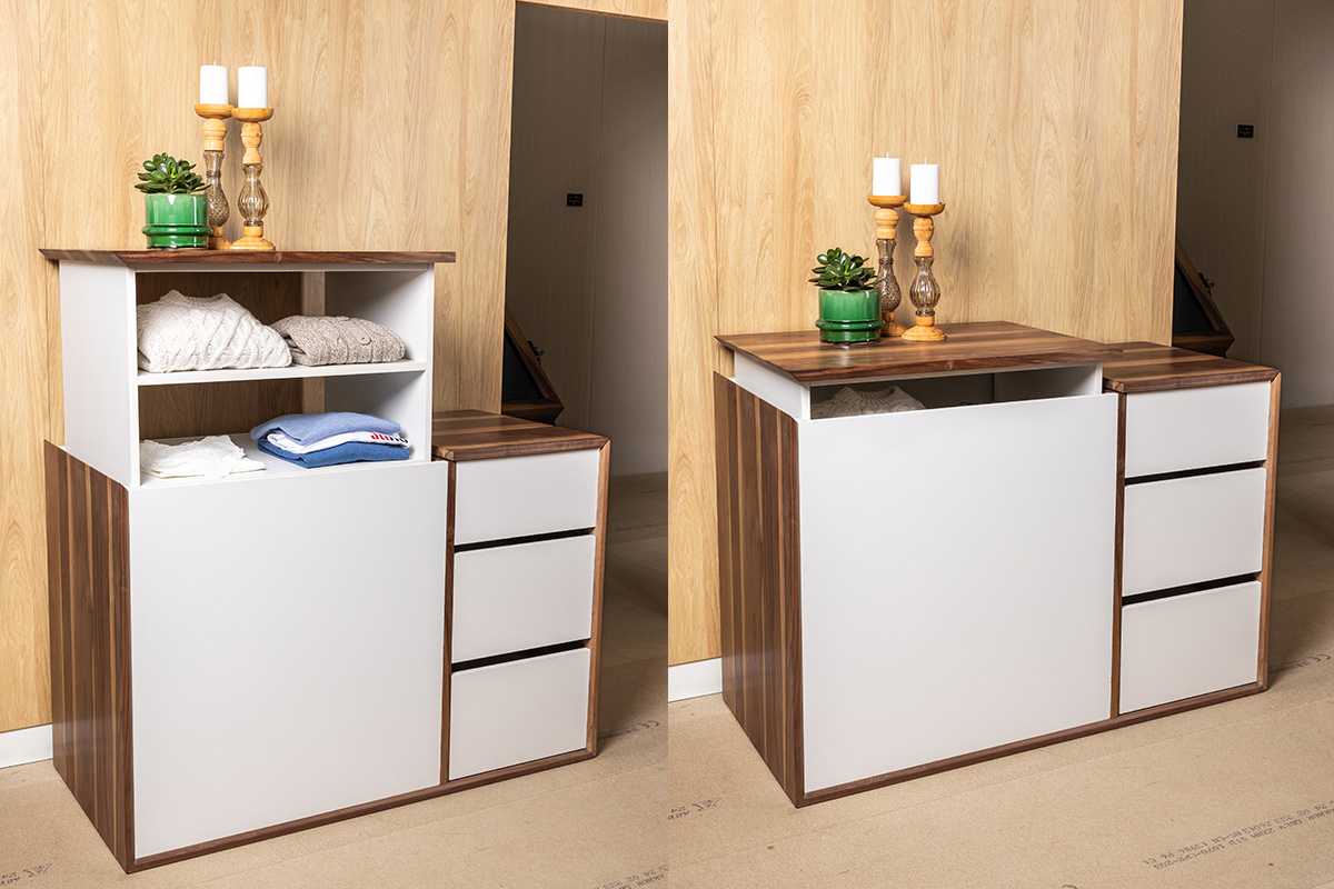 Inovatívne riešenie, ktoré umožňuje jednoduchý prístup k vrchným poličkám v skrini. Tento systém je navrhnutý tak, aby bol užitočný najmä pre ľudí so zdravotnými obmedzeniami. S možnosťou ovládania hlasom, tlačidlami alebo cez aplikáciu.
